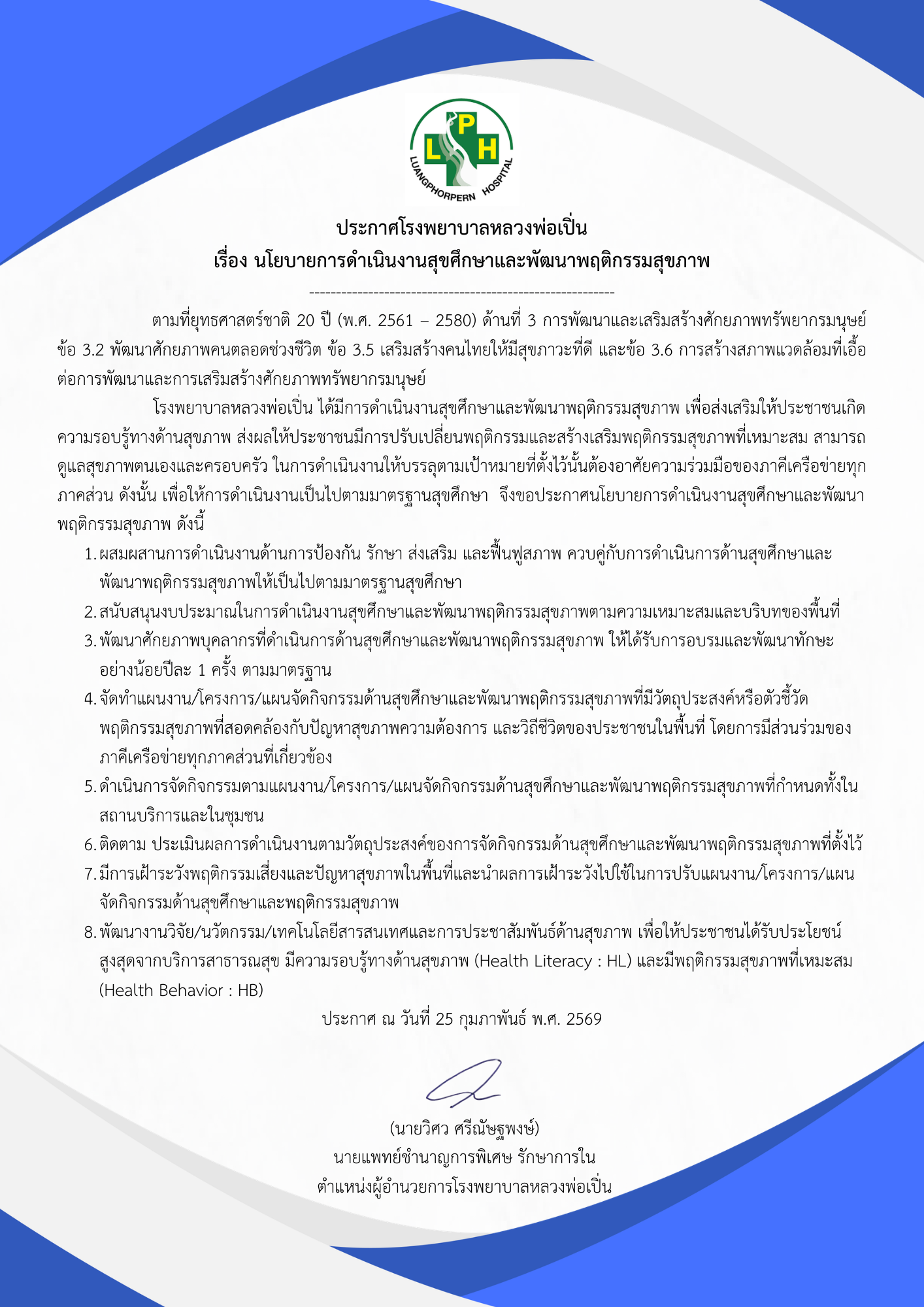 เรื่อง นโยบายการดำเนินงานสุขศึกษาและพัฒนาพฤติกรรมสุขภาพ